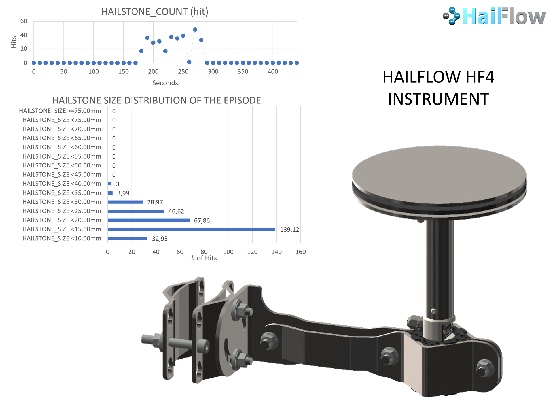 - Per-event hailstone counting, including maximum hit rates during storm peaks.