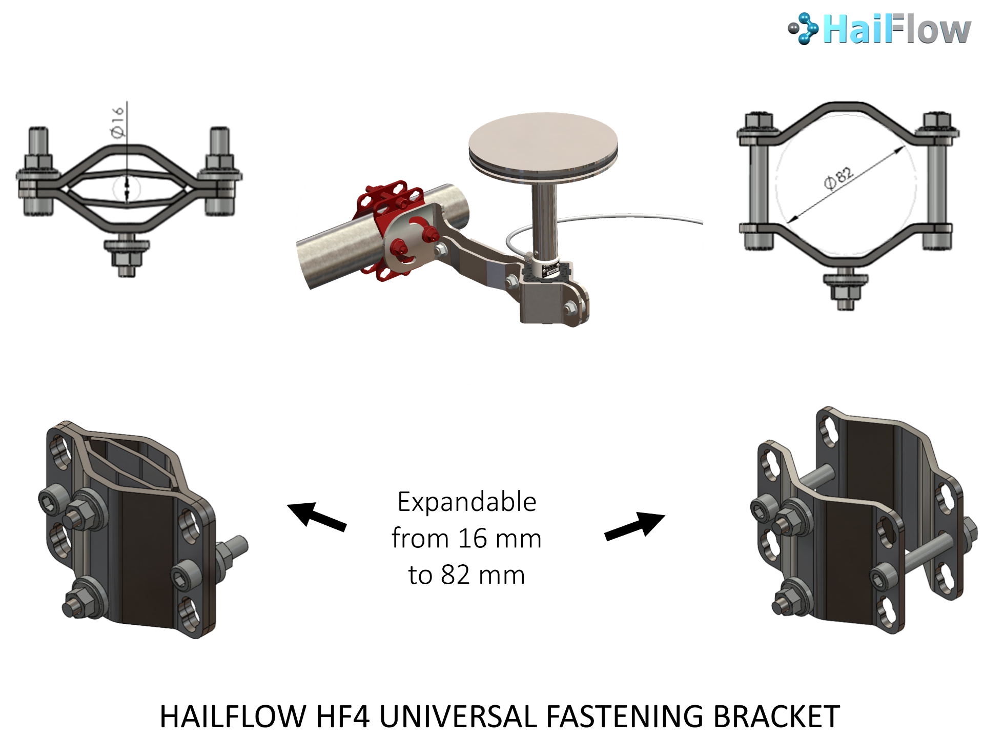 - Universal V-bracket mounting for mast diameters from roughly 16 to 82 mm, or any flat or rectangular surface.